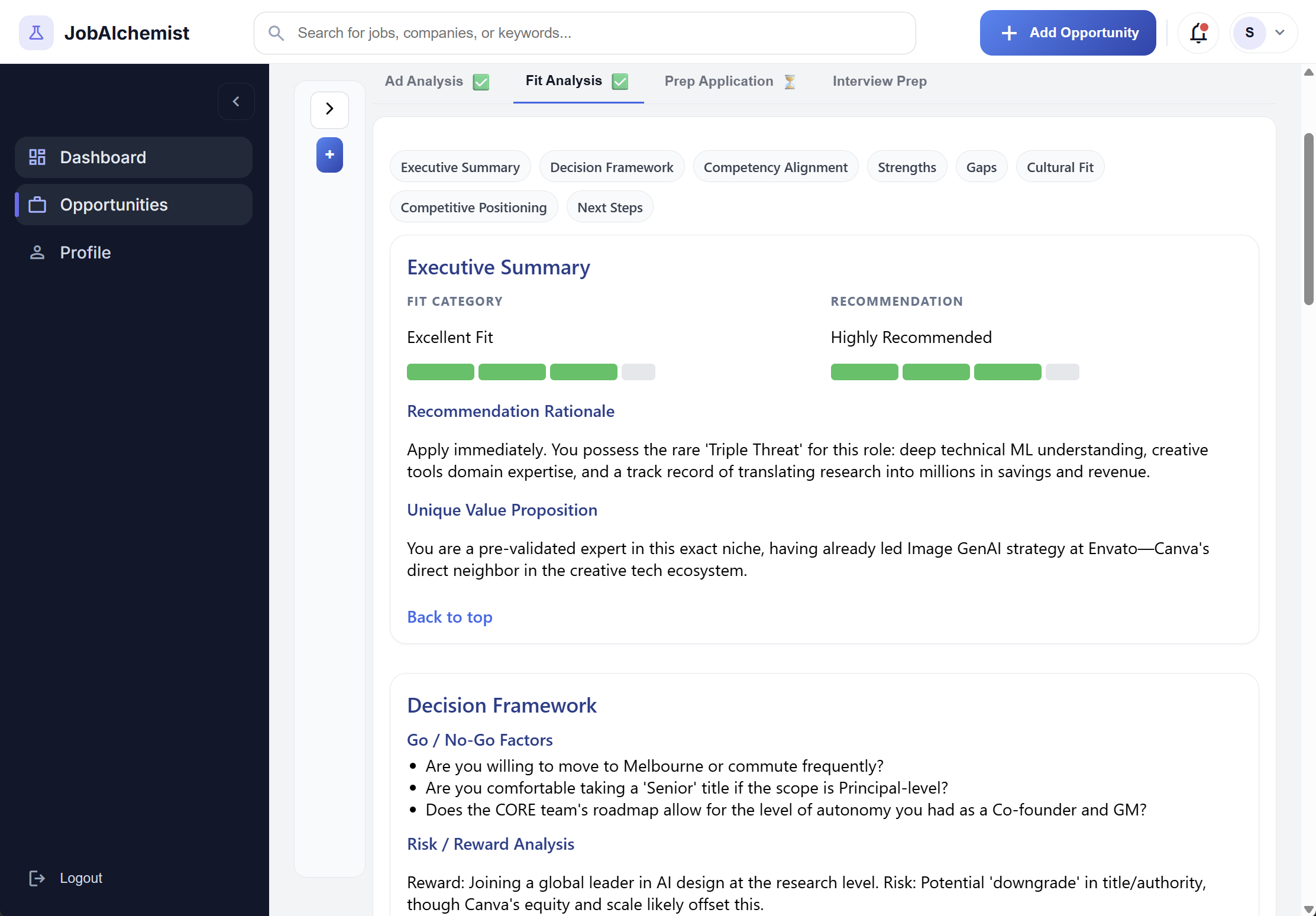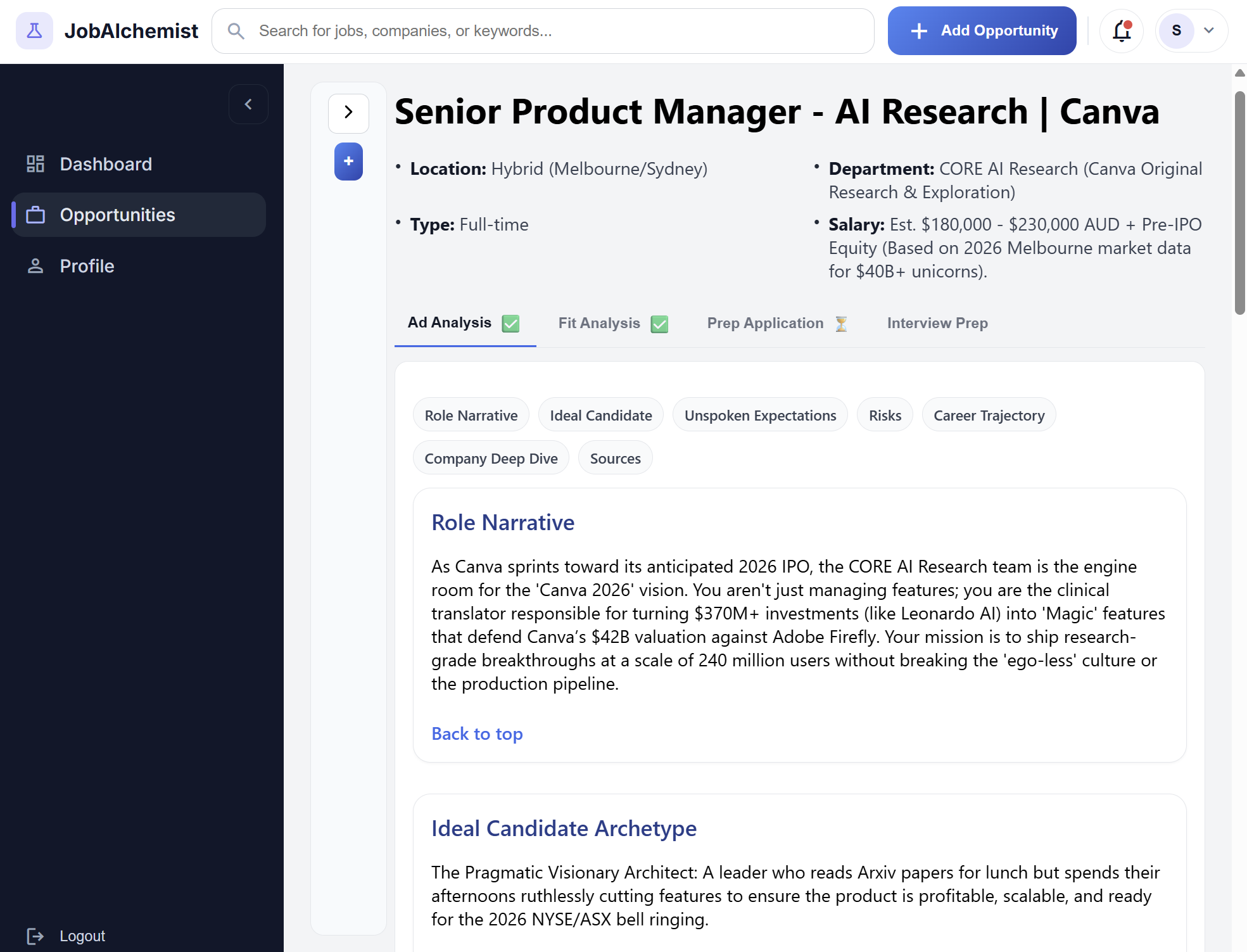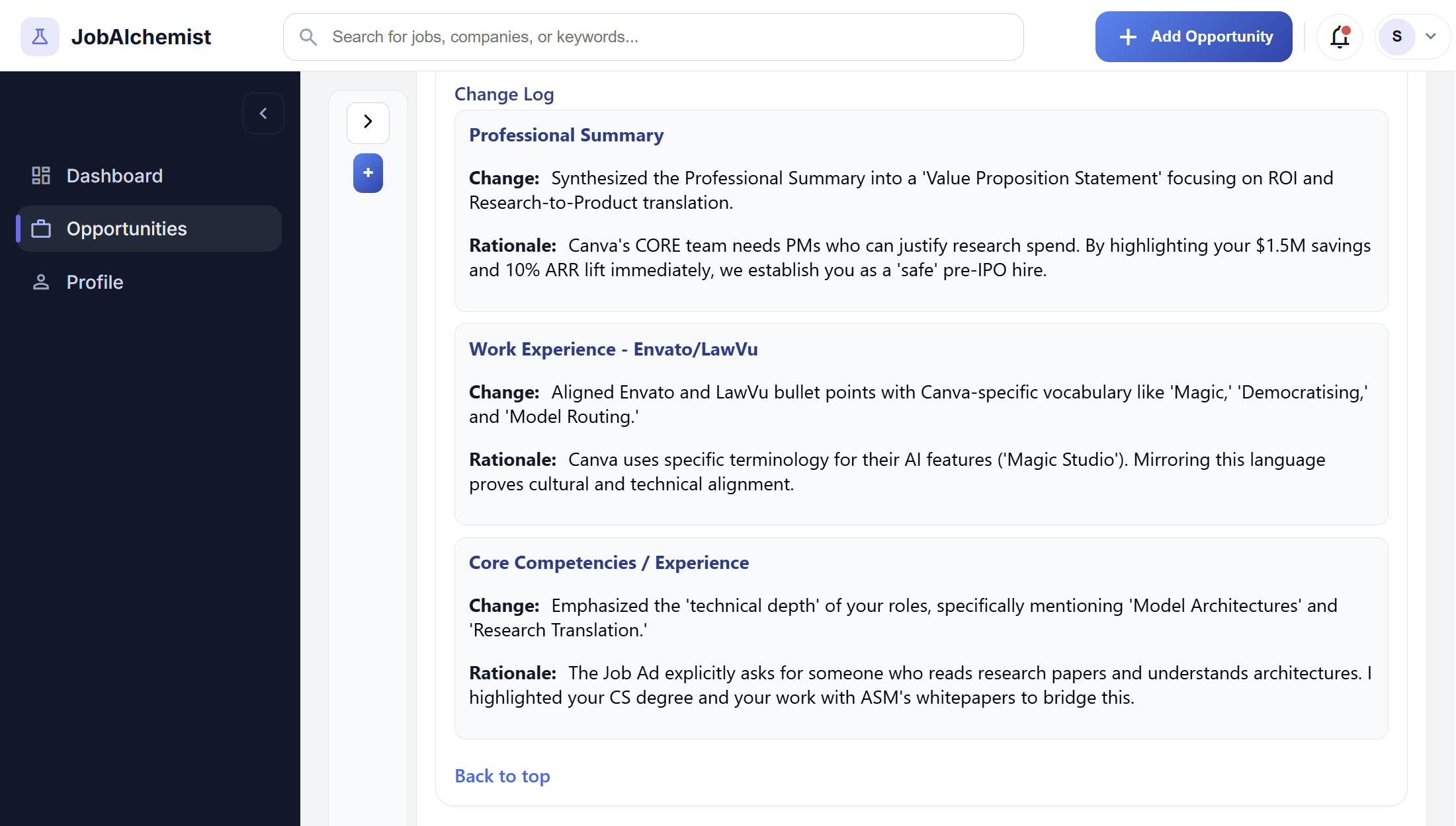 JobAlchemist is purpose‑built for job seekers, keeping your roles, drafts, and fit insights connected so every output is job‑specific, deeper, and more confidence‑building. Soon you’ll be able to review all opportunities in one place to make smarter decisions across your search.