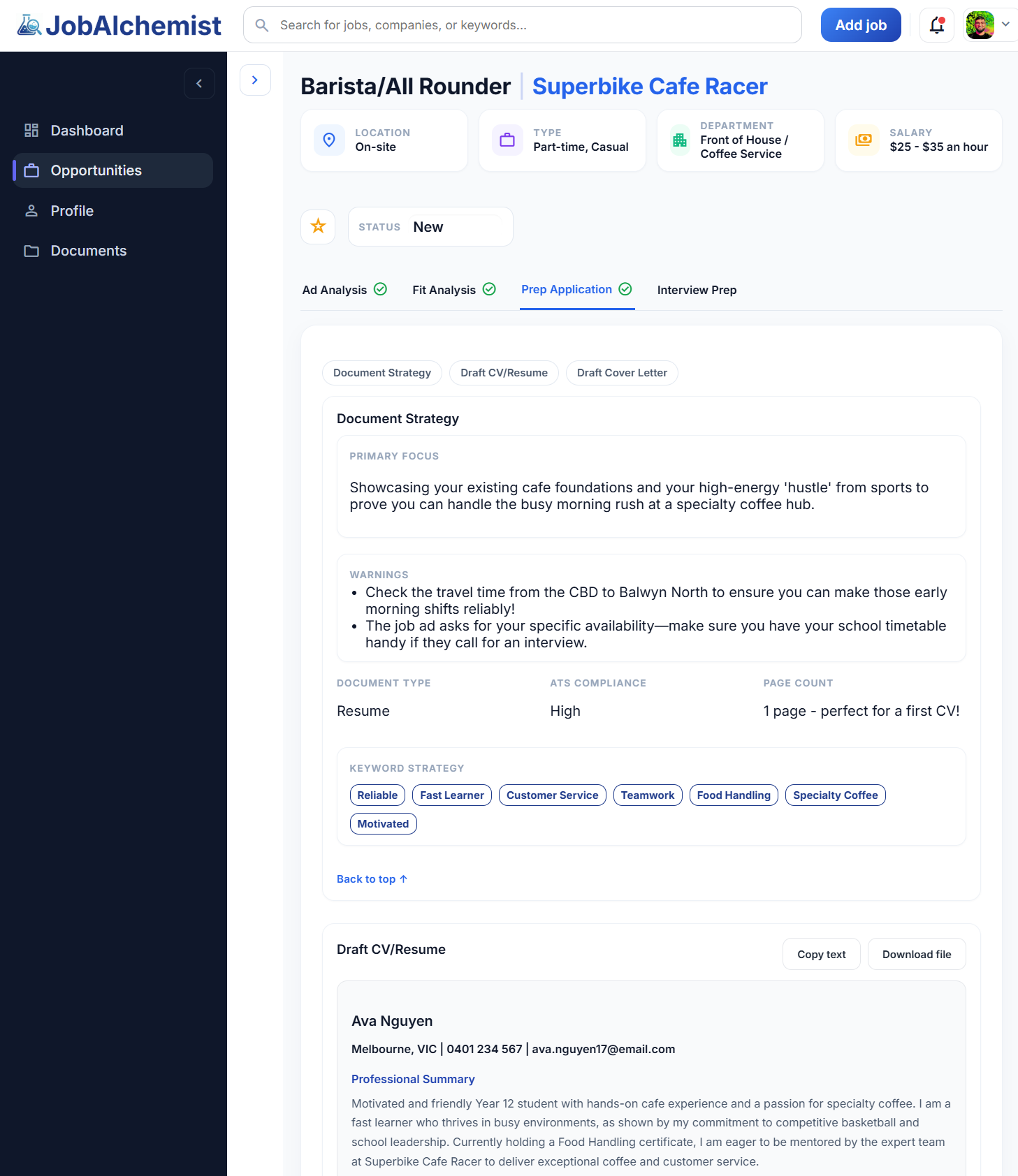 Paste the job ad and upload your CV. JobAlchemist shows what the role really needs, where your experience already fits, including school, sport, and volunteering, and how to tailor your CV and cover letter with clear guidance at every step.