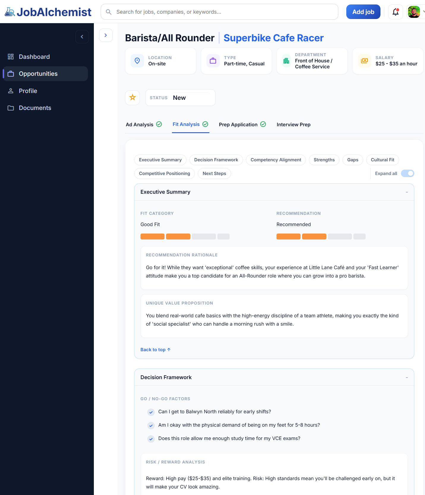 Every fit assessment includes practical guidance: how to interpret the job ad, what to strengthen in a CV, and how to frame experience in a way that's relevant to the role. Students aren't just handed a draft, they learn something from the process.